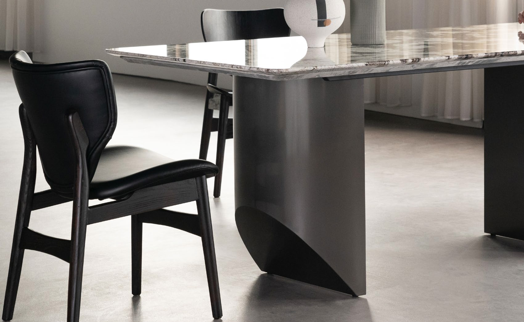 Introducing The Peak Series Dining Table, featuring Silver snow Natural Marble and Arabescato Corchia Sintered Stone & Smoky Wood tabletop options, all supported by a sturdy SIS Hairline Black Titanium base. This table offers a perfect blend of style and functionality, ideal for enhancing the dining areas of your hospitality establishment with luxurious sophistication.
